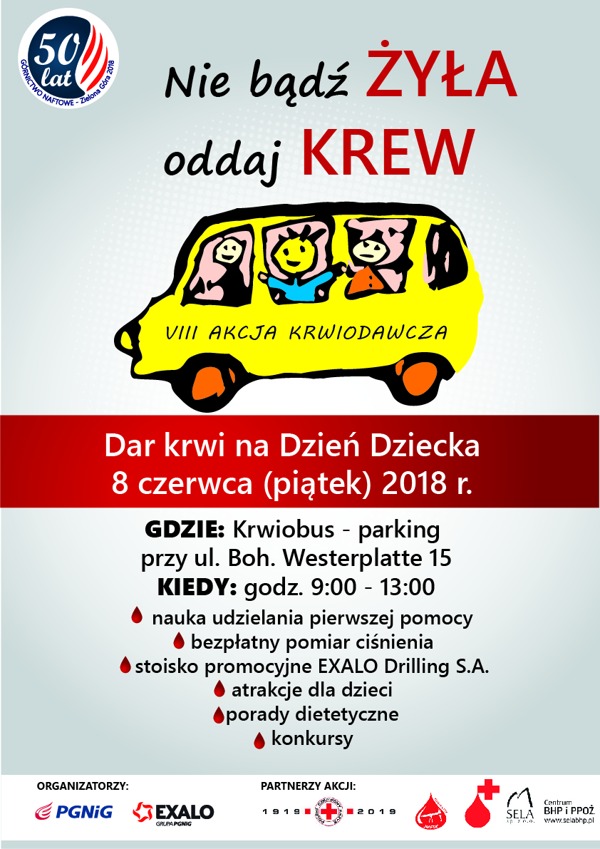 08 czerwca odbędzie się VIII edycja Akcji Krwiodawczej organizowana przez PGNiG Oddział w Zielonej Górze i Exalo Drilling S.A. pod hasłem Dar Krwi na Dzień Dziecka. Dzięki zaangażowaniu lokalnej społeczności oraz pracowników PGNiG i Exalo podczas zeszłorocznej edycji zebrano ponad 12 litrów krwi.
