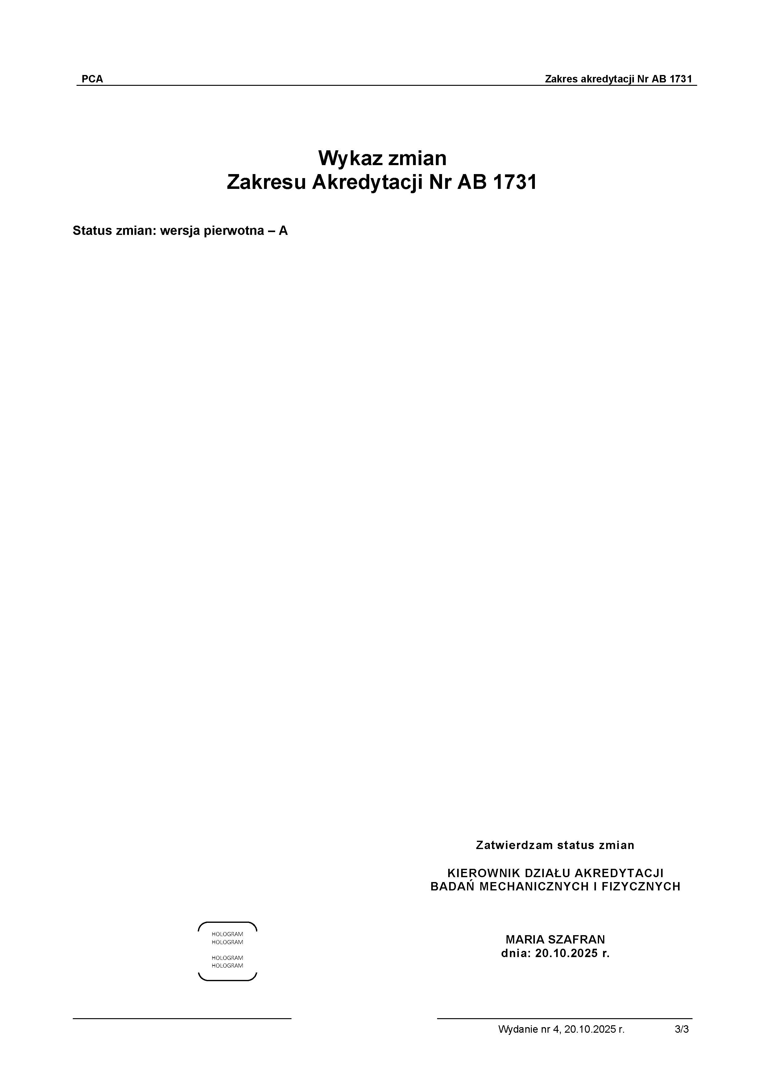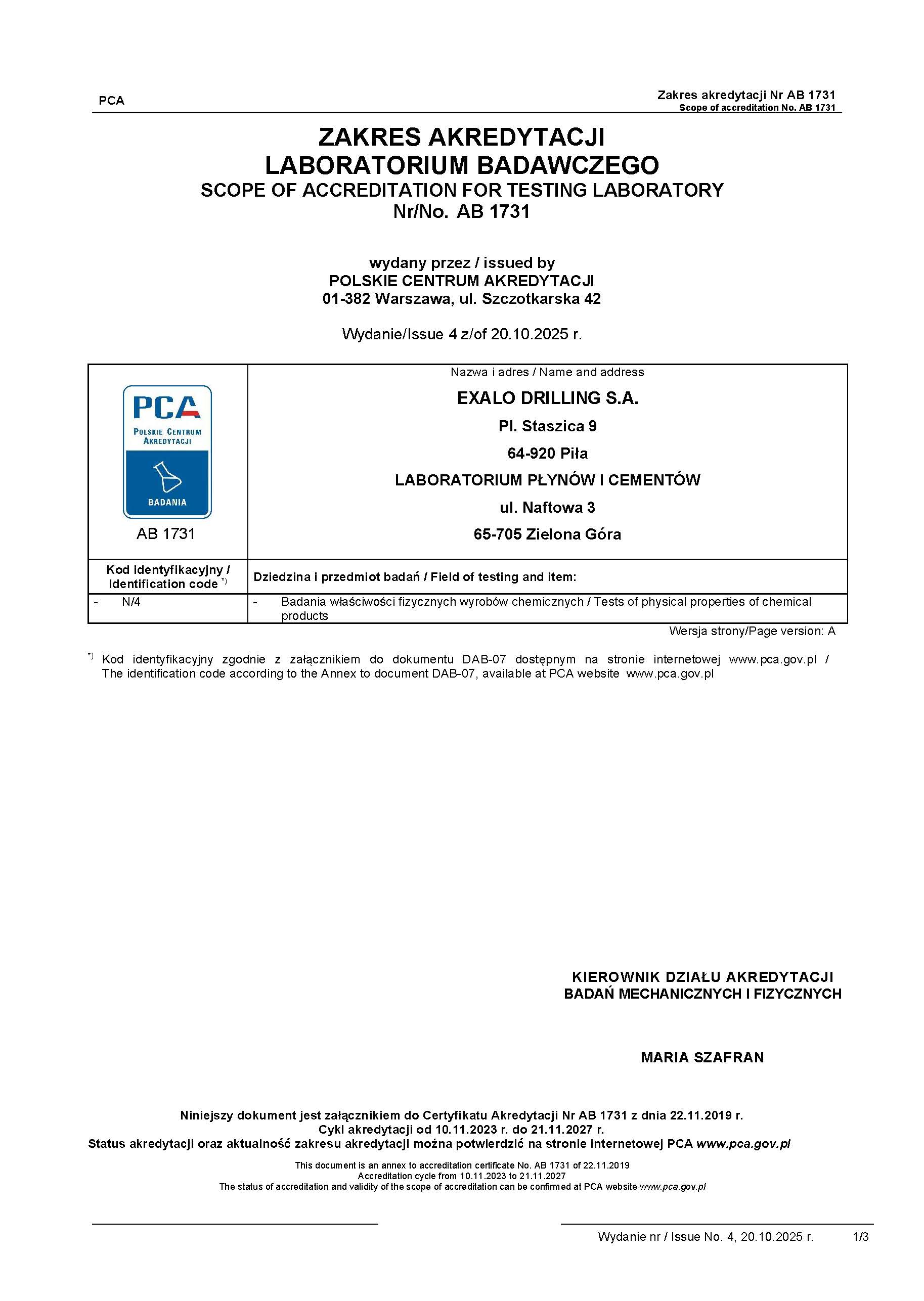 Potwierdzeniem kompetencji, bezstronności i wiarygodności działań Laboratorium jest przyznany przez PCA Certyfikat Akredytacji laboratorium badawczego w zakresie akredytacji numer AB 1731 dla spełnienia wymagań normy PN-EN ISO/IEC 17025:2018-02.