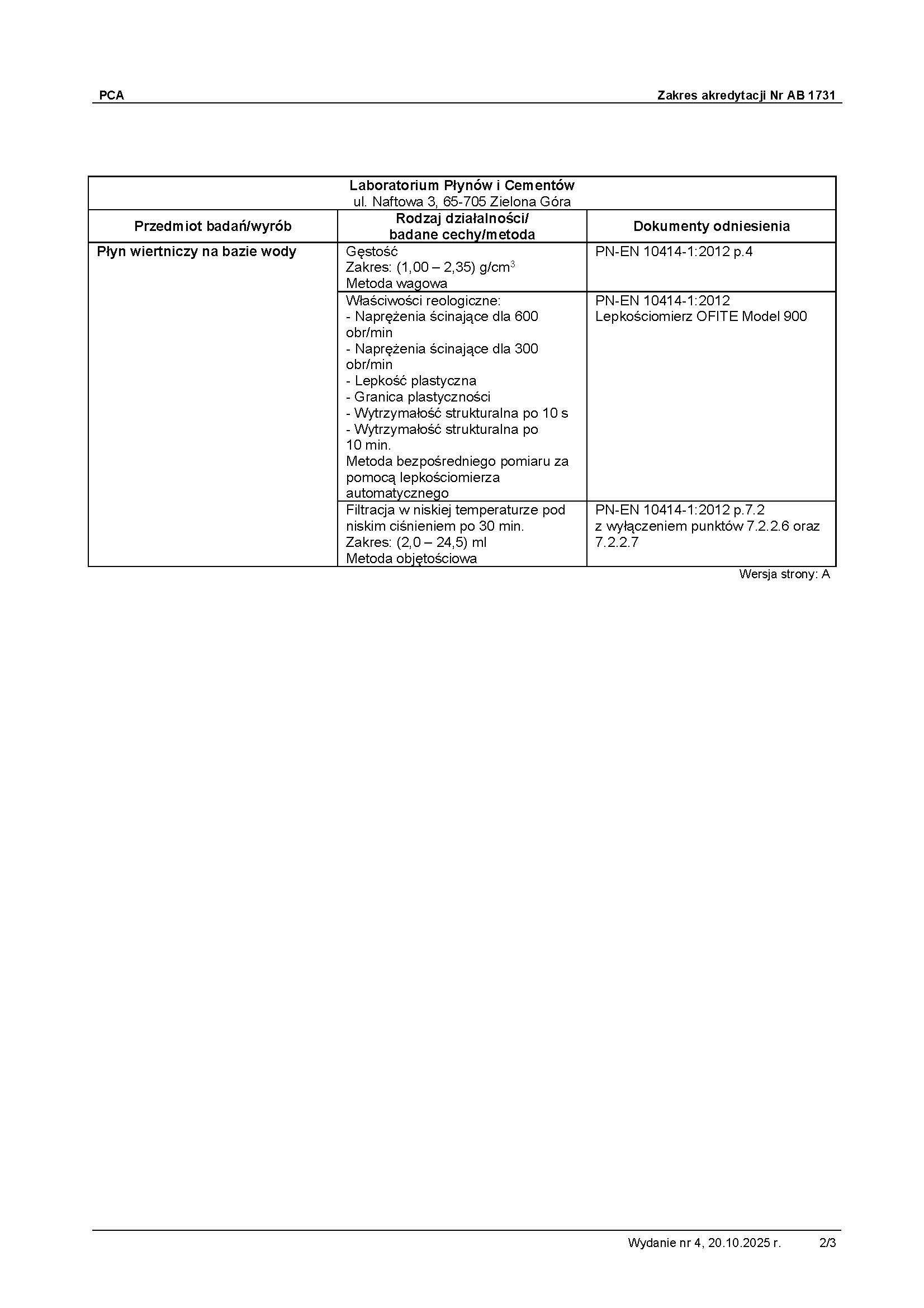 - Płyny wiertnicze – „Przemysł naftowy i gazowniczy. Badania polowe płynów wiertniczych” PN-EN ISO 10414; Część 1, Część 2.