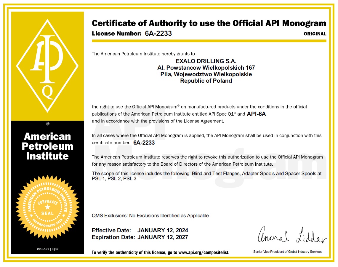 Certyfikat | Certyfikat API 6A - 2233 (Certificate of Authority to use the official API Monogram) |